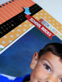 For this layout, I mixed and matched a lot of different patterned papers, so I decided to keep the embellishments fairly simple. However, I couldn't resist popping that pushpin sticker up with some foam adhesive to make it look like it was pinning the "school rocks" banner to the layout.